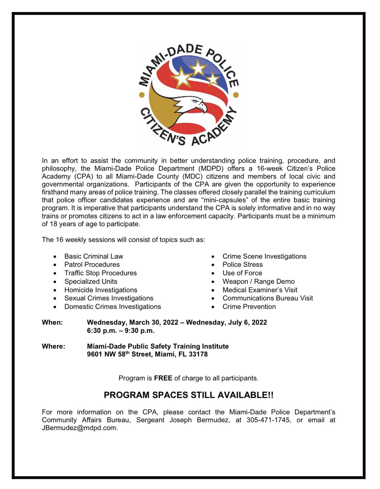 Miami Dade Police Department The Miami Dade Police Department Is Now Accepting Applications For Citizen S Police Academy Cpa Class 46 The Cpa Is A 15 Week Program That Consists Of Class Room Lecture Practical